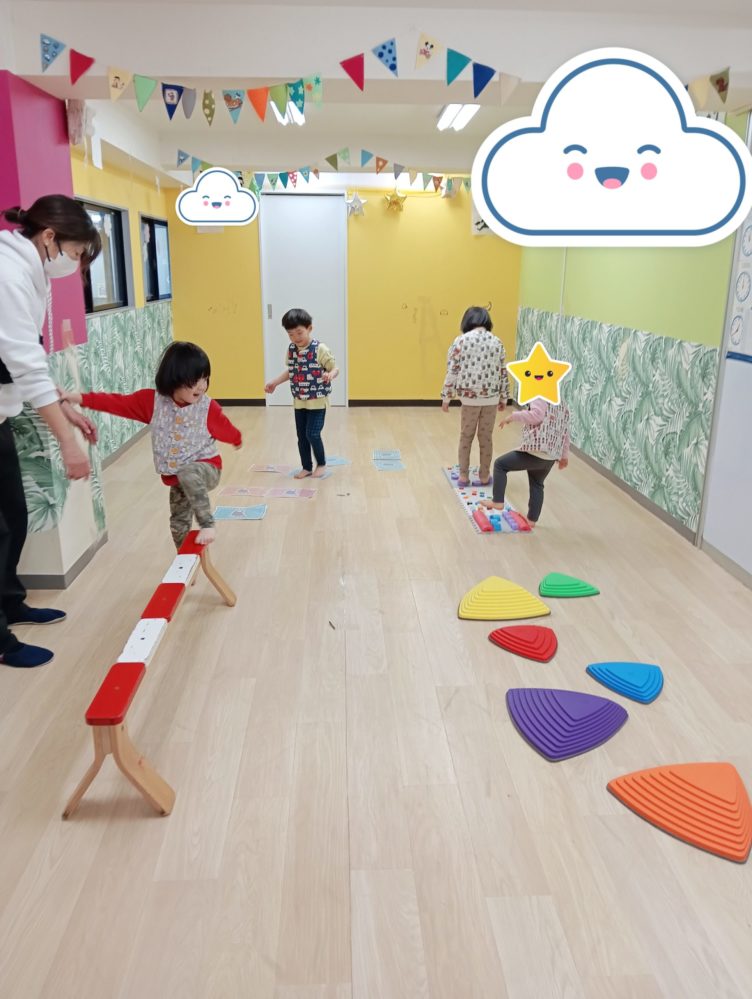 午後は室内でバランスサーキットや子供たちが考えた、おともだちとペアになって頭でバランスをとるバランス島渡りなどに取り組みました!