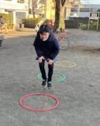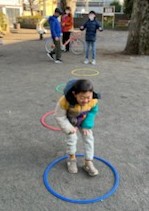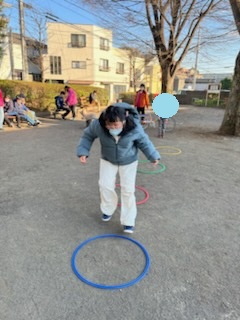 みんなが揃ってからは、しじゅうから第二公園へ行って、フープジャンプをしてきました!いつもは、ジャンプせずにほいほいほいっと跨いでしまう子がいるので、今回は、幅を広く取り……しっかりとジャンプしないとクリアできない仕様にしてみました(笑)