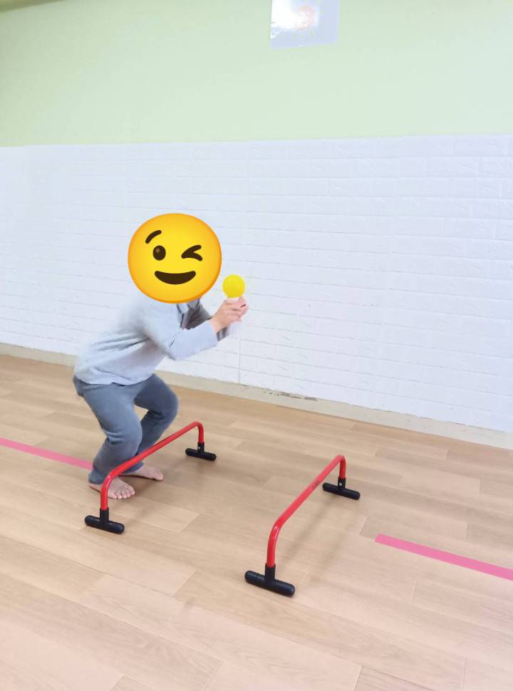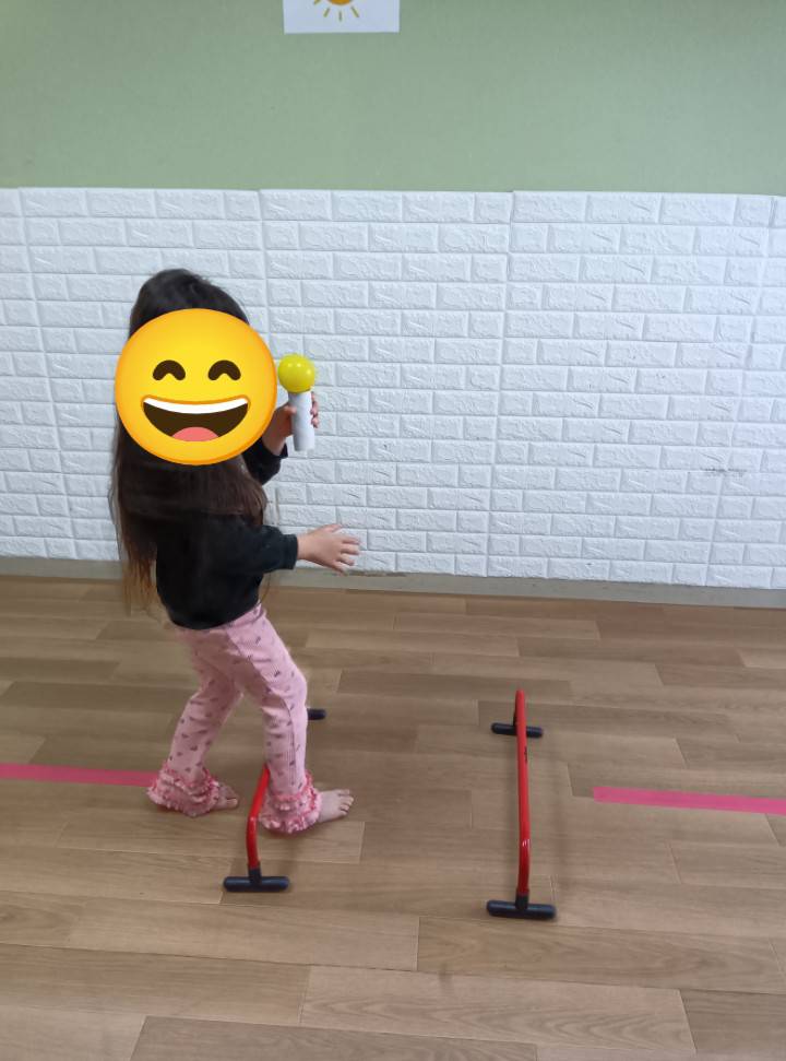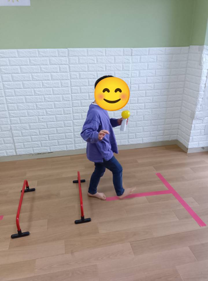 バランス歩き🦶 ワクワク 2026.03.25 こんにちは。 トイレットペーパーのしんにボールを置いて落ちないようにバランスを取りながら歩いたよ👣 障害物のハードルをまたぎます。重心を低くし慎重に進みます。 さあ、ゴールだよ!ボール落とさなかったね!頑張りました🌸🌸🌸 やまもと