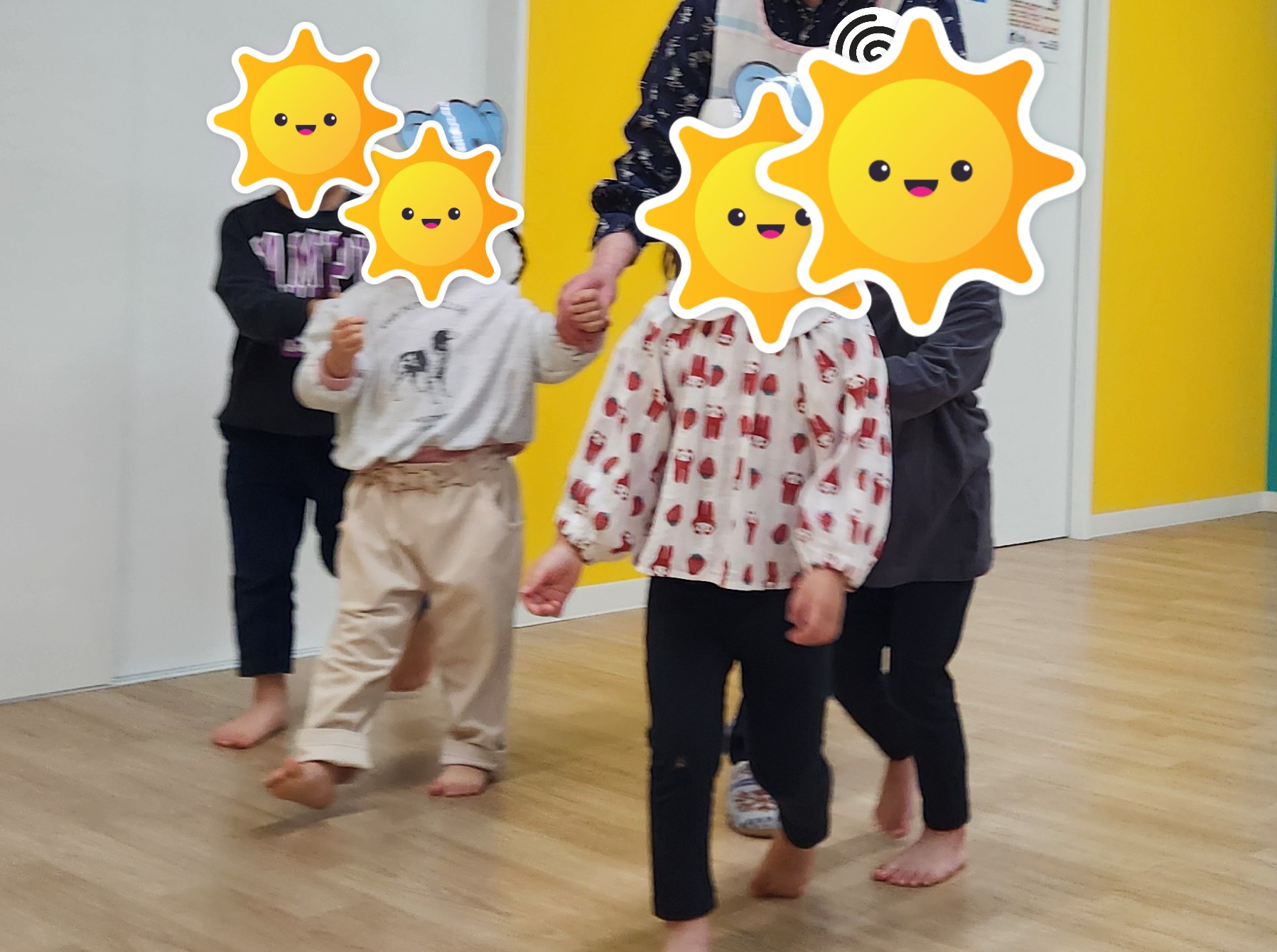 今週はみんなで列になって歩いていく遊び『ぞうさんとくものす』に取り組んでいきます!先頭のお友だちに名前を呼ばれたら、どんどん後ろにつながっていきます。お歌に合わせお友だちと同じペースで歩く練習にもつながっています。