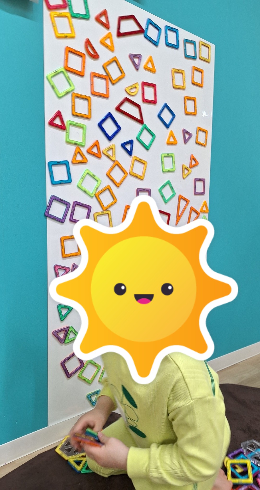 自由遊びの様子です。たくさんの磁石を壁に貼り付けて遊んでいました。そのうち数人で高い所に貼ったり、ドア一面に貼ったりとおしゃべりしながら協力して磁石だらけにしていましたよ。